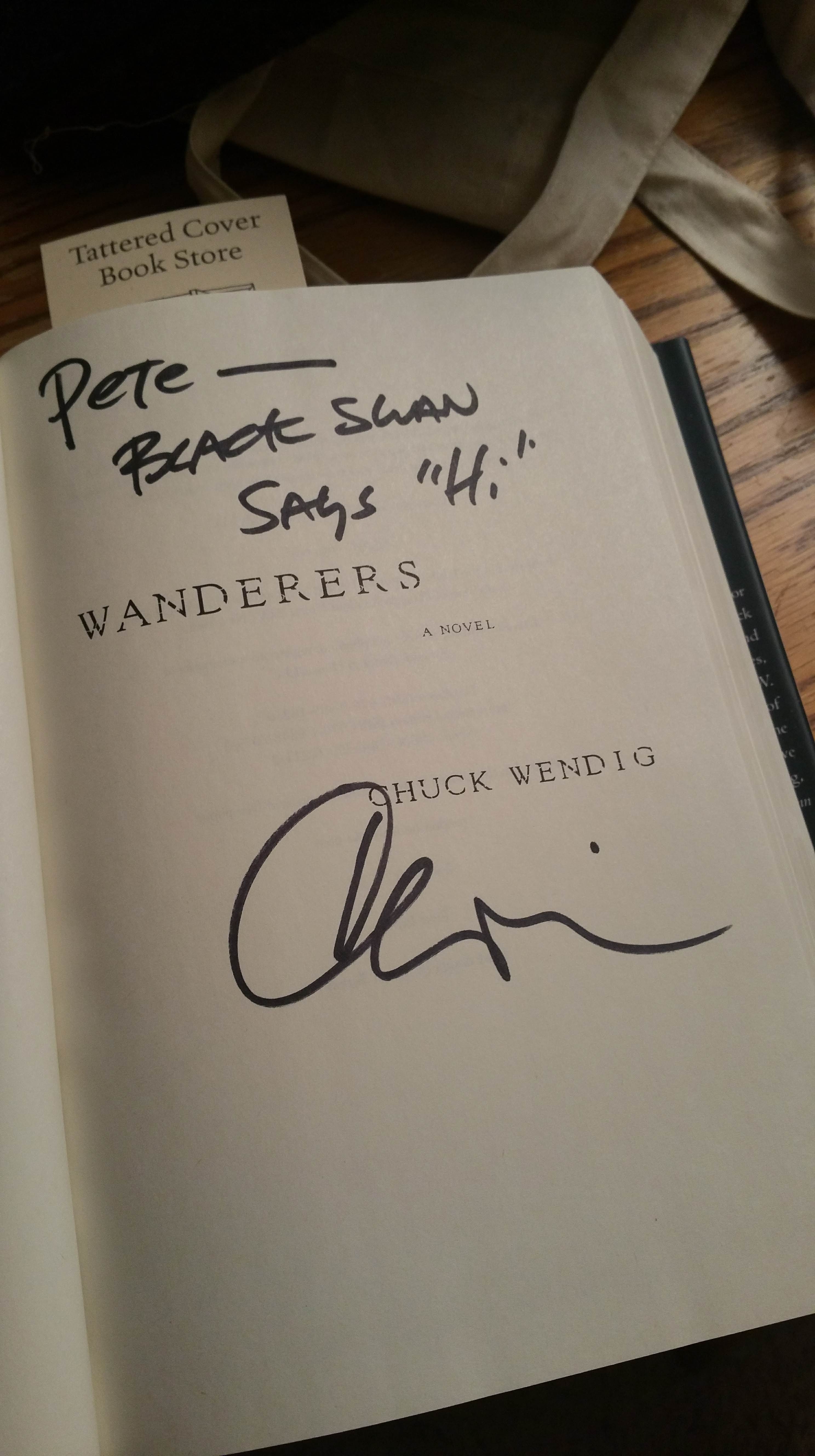 Last Tuesday evening I drove on down to Tattered Cover books in Denver to see Chuck Wendig on the last stop of the Wanderers tour. (“What’s Wanderers, precious?” I hear you say. It’s a bloody good book, I answer. Lookie here.) I walked into the store, then I walked into the man (really – he happened to be near the door and was right in front of me as I entered. I shook his hand. I haven’t washed that hand since.)