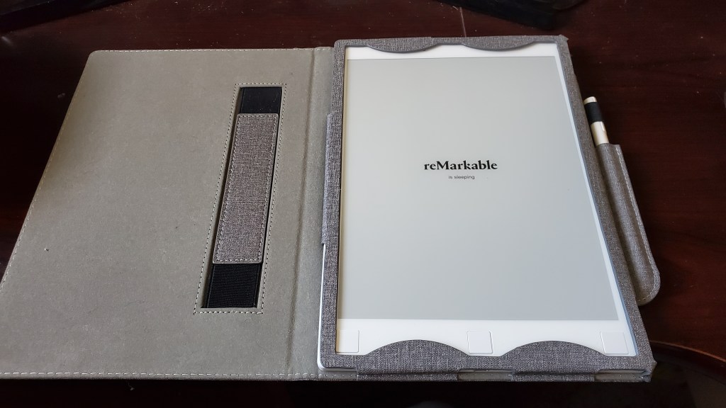 Don’t bother with the slip case (they call it a folio, but it isn’t). It’s $80 and it’s not worth it. You can’t use the device while it’s in the case, so you run the risk of leaving the case somewhere and forgetting it. It doesn’t even have a hole for the charger cord – so you have to leave the thing out, unprotected, while charging. I found several folio cases online, designed specifically for reMarkable, at prices from $15 to $25. The one in the photo above cost me $20 and it’s awesome.